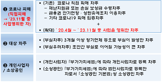 ①코로나 피해를 입은 ②부실차주 또는 부실우려차주에 해당하는 ③개인사업자 또는 법인 소상공인에 한하여 신청이 가능합니다.
